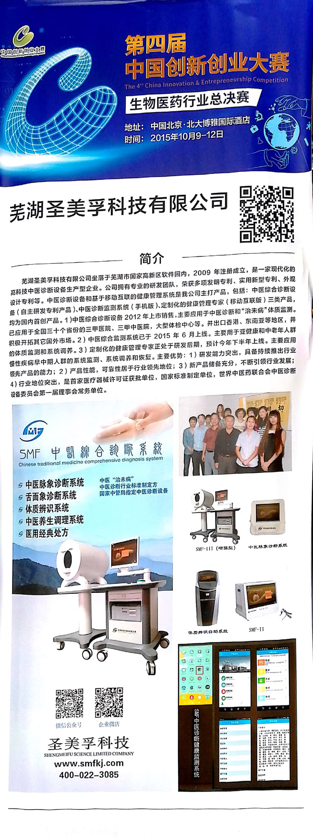 2015年,“中醫(yī)脈象診斷系統(tǒng)”、“SMF中醫(yī)舌面象儀”兩項(xiàng)產(chǎn)品入選全國衛(wèi)生產(chǎn)業(yè)管理協(xié)會(huì)首批“治未病服務(wù)適宜設(shè)備”;