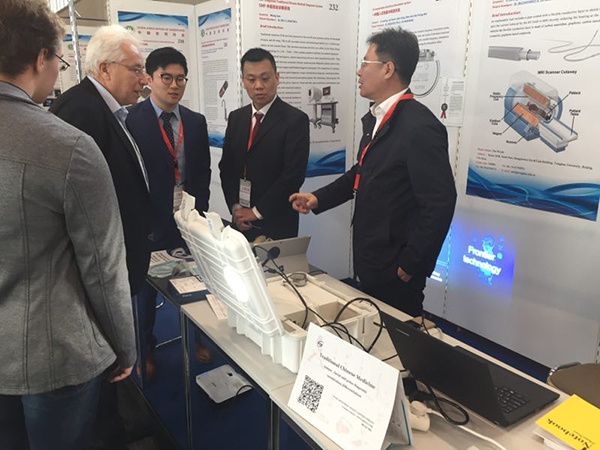 蕪湖圣美孚科技有限公司申報項目在順利通過國內多重審查遴選后,成為中國中醫(yī)診療設備企業(yè)代表,作為中國代表團成員參加了本次發(fā)明展。同時受邀參展的中國代表團項目成員還有清華大學、北京交通大學、北京宇航系統(tǒng)工程研究所、中國航天科技集團、國家電網(wǎng)公司等。11月2日展會開幕,中國駐德國大使館特派科技一秘李國強教授前來展會參觀中國代表團并鼓勵。